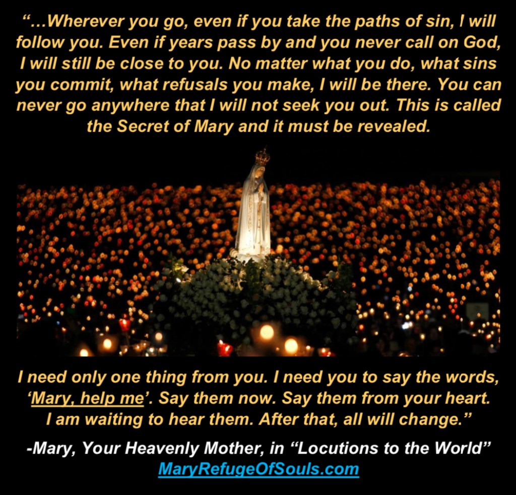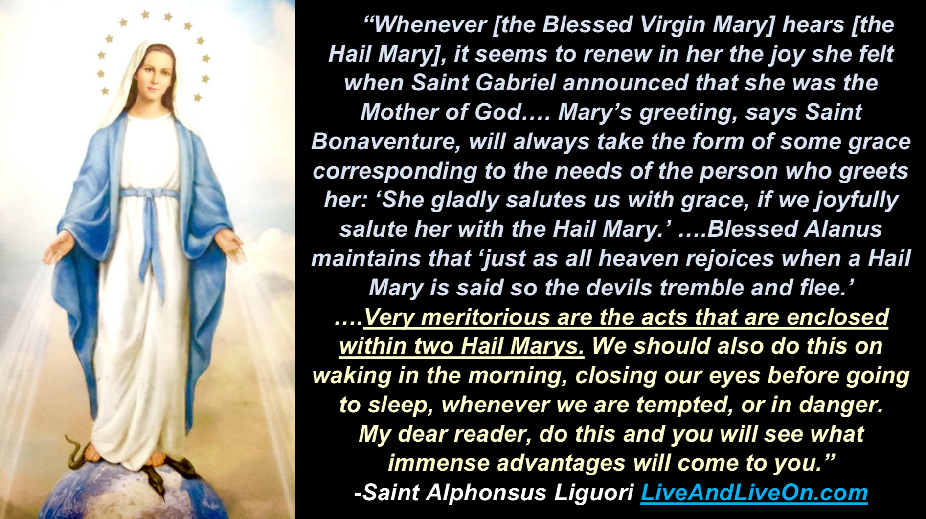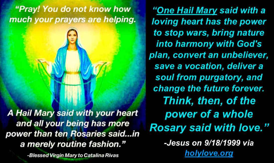 Jesus Himself once revealed to the Stigmatist and visionary Catalina Rivas that “Each decade of the Holy Rosary you repeat, the angels gather and place as an offering at the feet of My Mother.” WOW! Imagine all the eternal treasures you will storing up for yourself in Heaven and the all graces and blessing you will giving to others with on earth if you began by just a few more prayers here and there! Try squeezing Hail Marys between bites, before classes/work, while washing your hands, and most of all in the most golden and glorious moments after receiving Our Lord Himself Holy Communion at Mass, just like Our Blessed Mother received Him at the moment of the Incarnation, when God became Man and the Word became Flesh in her Womb! And in addition to passing many mystical graces to others through these fervent, frequent Hail Marys, eventually you may just find yourself giving out brighter smiles, warmer words, and cheerier acts of kindness toward all of those around you, who you formerly may have been failing to notice, to reach out to, to forgive, and to truly love! Even if you’re distracted while praying (by the whirlwind of activities occurring around and within you), YOU WILL STILL BE SAVING SOULS through your smallest prayers! For the Blessed Mother has promised that She sends Her angels to collect the fragments of such prayers, in order to make them wholesome and even beautiful in the Eyes of God! Are you starting to see how, with Momma Mary, you really can’t lose!