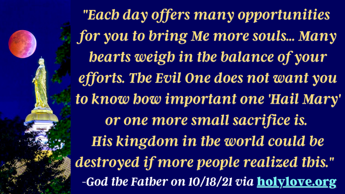 This is why I tell you, as long as you pray, you are chipping away at Satan’s overall scheme of things and winning many small victories. Often you do not see the effects your prayers have upon evil efforts. If you pray your whole life and save just one soul, your life is victorious. However, I tell you, many rosaries save many souls – souls you will not meet until the next life.”