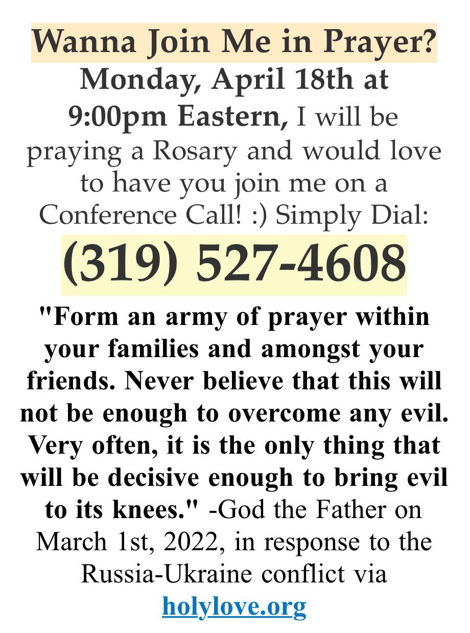 “Form an army of prayer within your families and amongst your friends. Never believe that this will not be enough to overcome any evil. Very often, it is the only thing that will be decisive enough to bring evil to its knees.” -God the Father on March 1st, 2022, in response to the Russia-Ukraine conflict via holylove.org