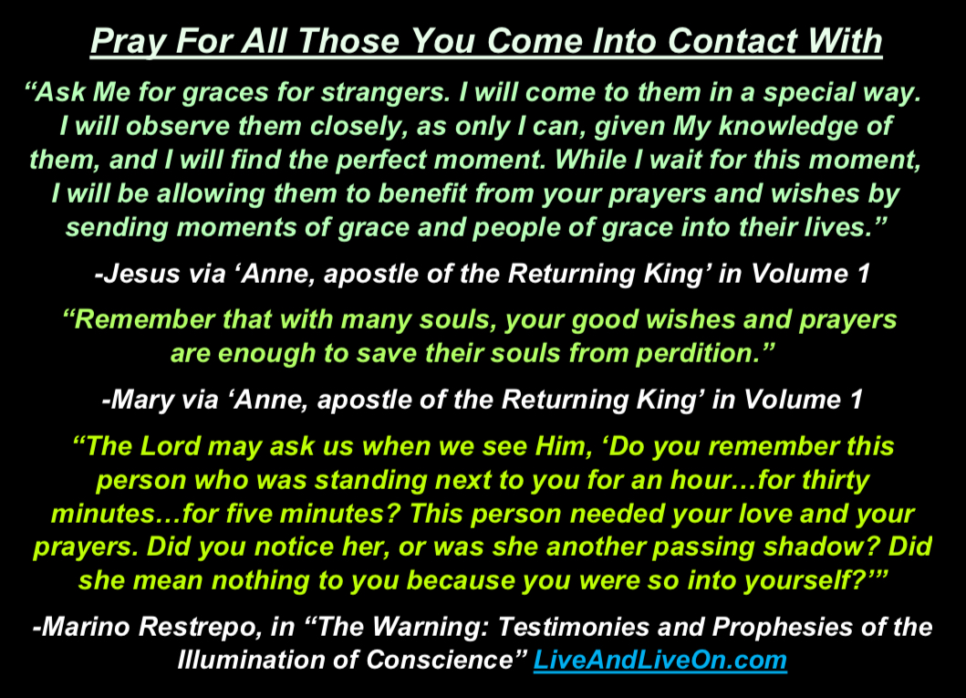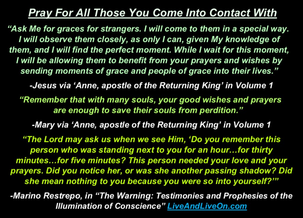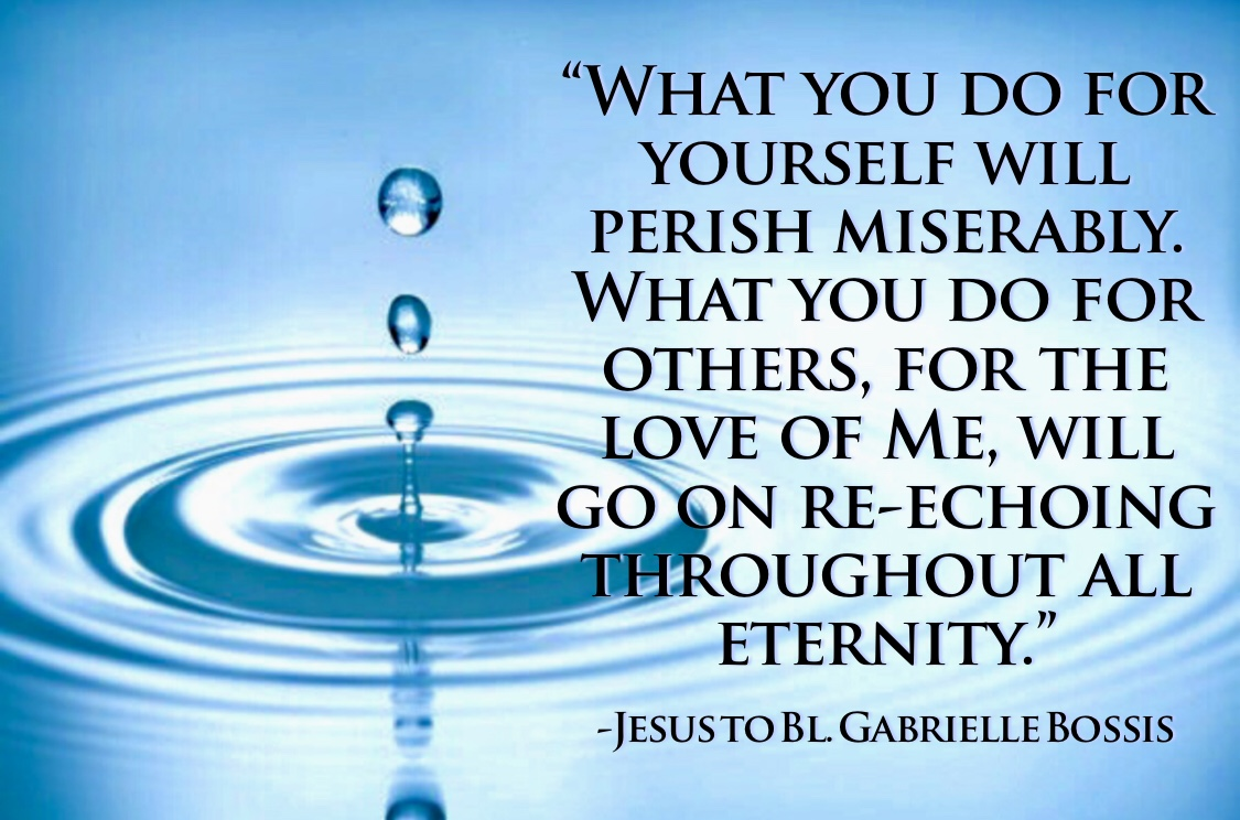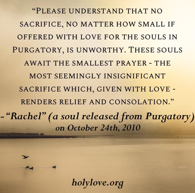 Pero piensa en todas las almas alrededor del mundo cerca de la muerte ahorita, almas que de lo contrario podría perderse para siempre sin nuestras oraciones, nuestros esfuerzos, nuestro amor…