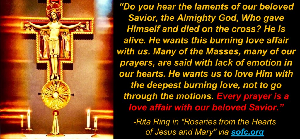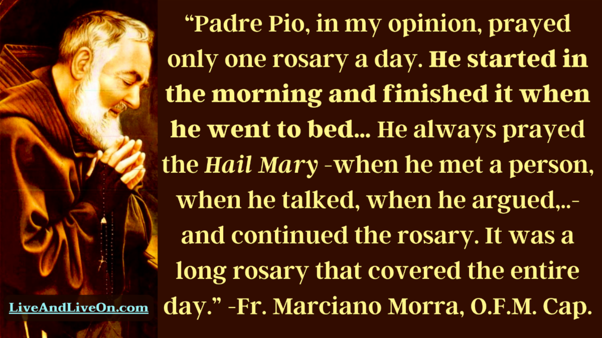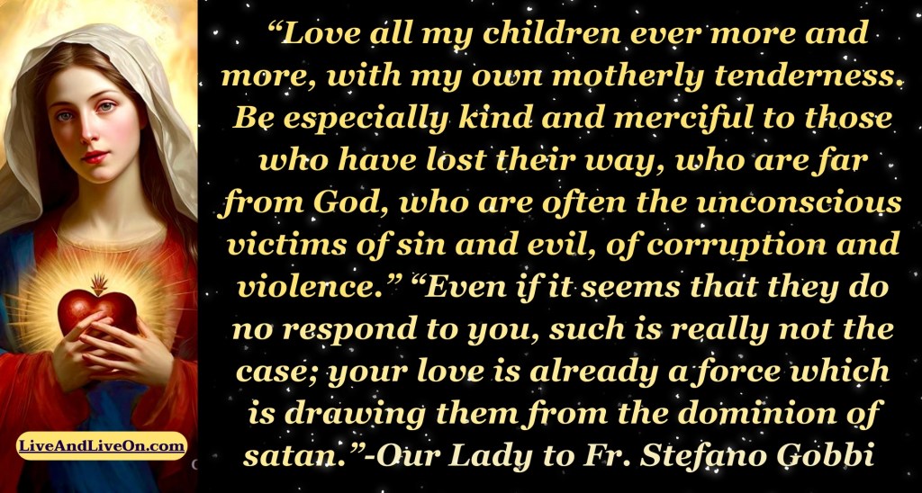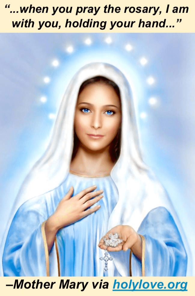 And as He Himself tells us, “…if you knew the power of the Rosary you have in your hands and pray with your hearts, you would never let go. It would always be with you and prayers would always be on your lips…” and also, “…you never know what one more Hail Mary will bring. A Hail Mary prayed with a loving heart has the power to stop wars…to convert a non-believer, to save a vocation, to free a soul from Purgatory, and to change the future forever. Think, then of the power of a whole Rosary said with love.”*