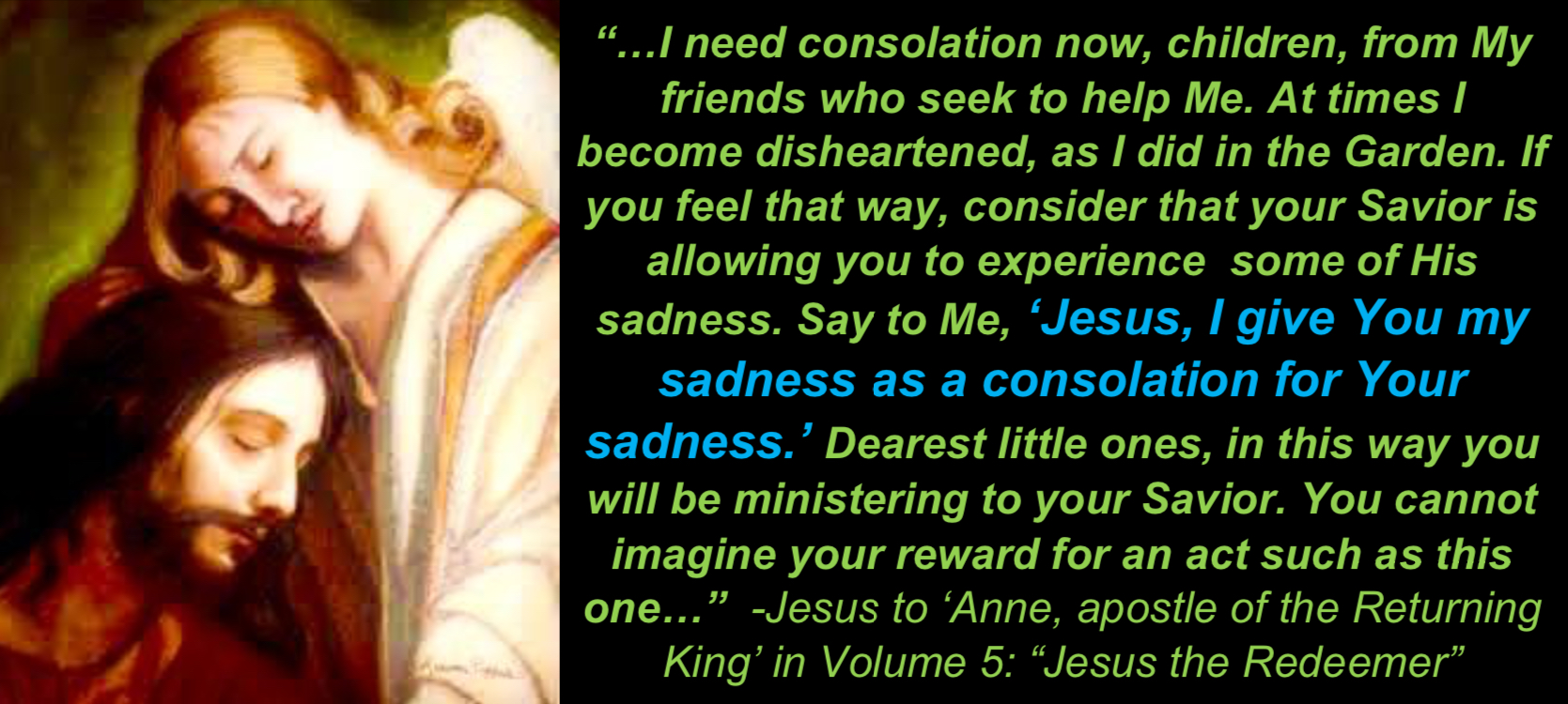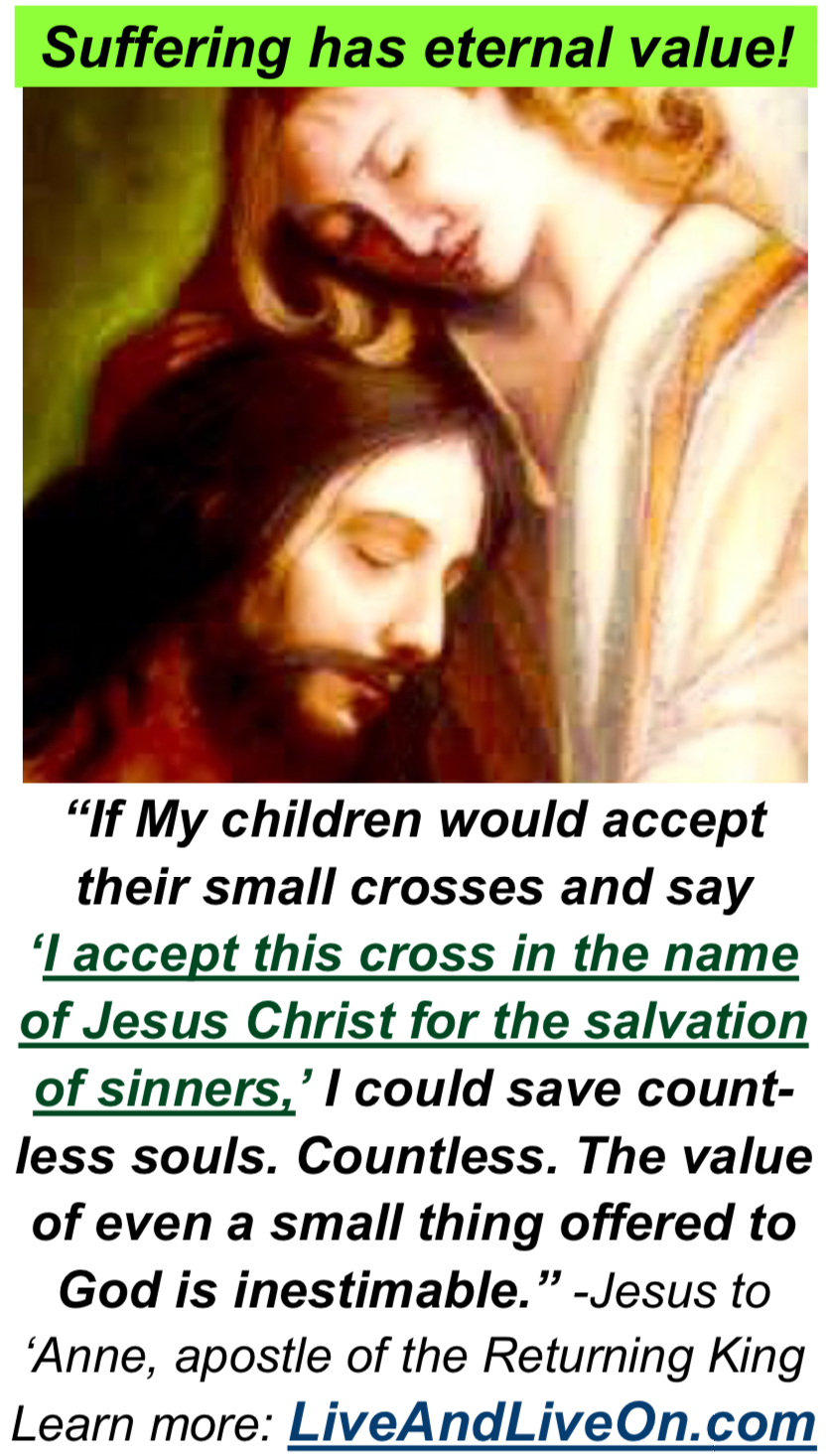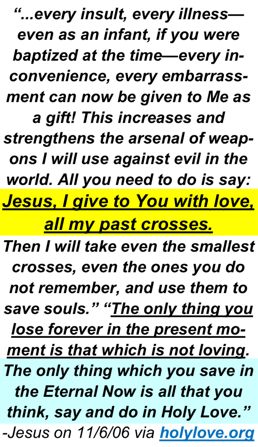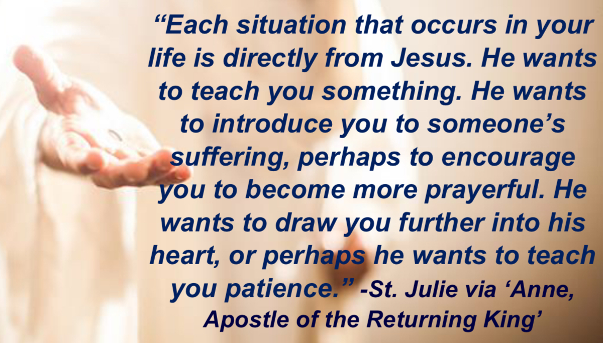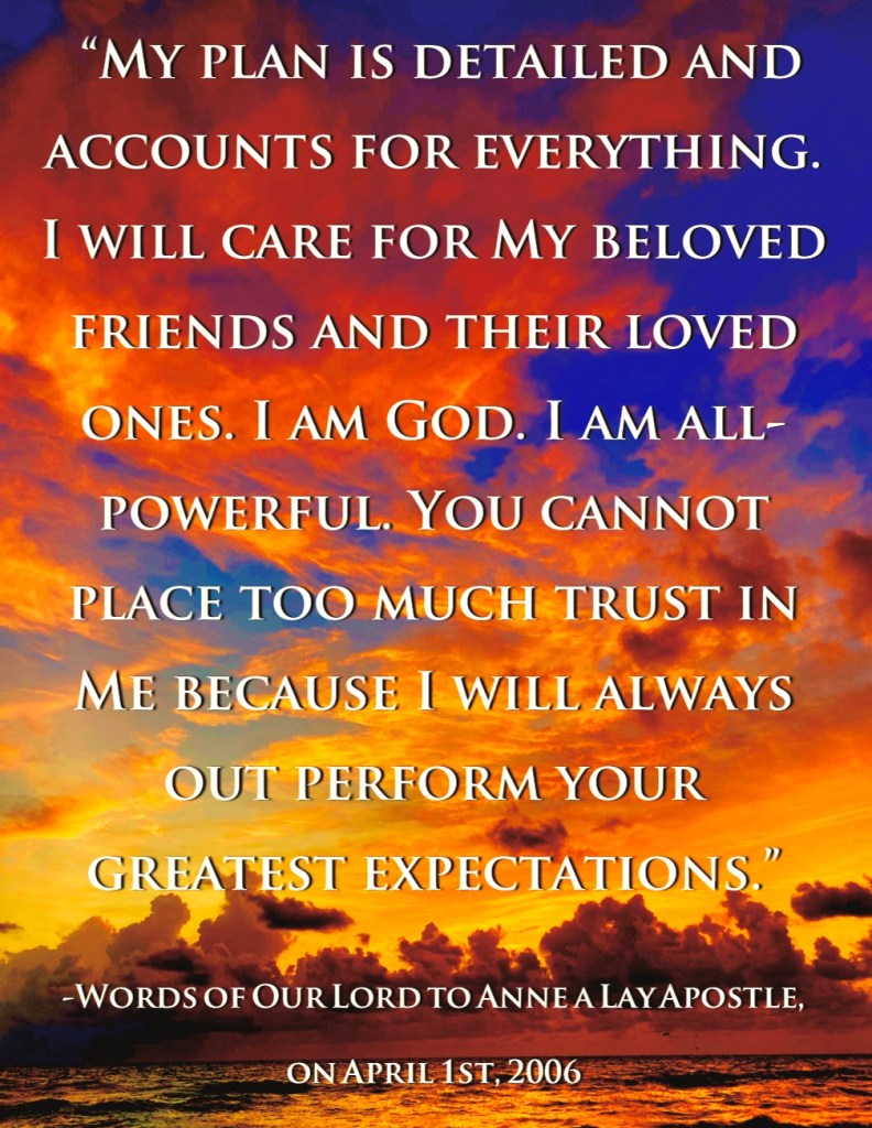 “Do not be quick to question circumstances and events of the day, but see My Will in every present moment. Carry in your heart and upon your lips, the ejaculation, ‘Eternal Father, I trust in Your loving Will for me.’ This little prayer carries with it- peace. I send an angel to assist you when you believe.” “I, your Eternal Father, desire this be made known and be made popular.” -God the Father (see: holylove.org)